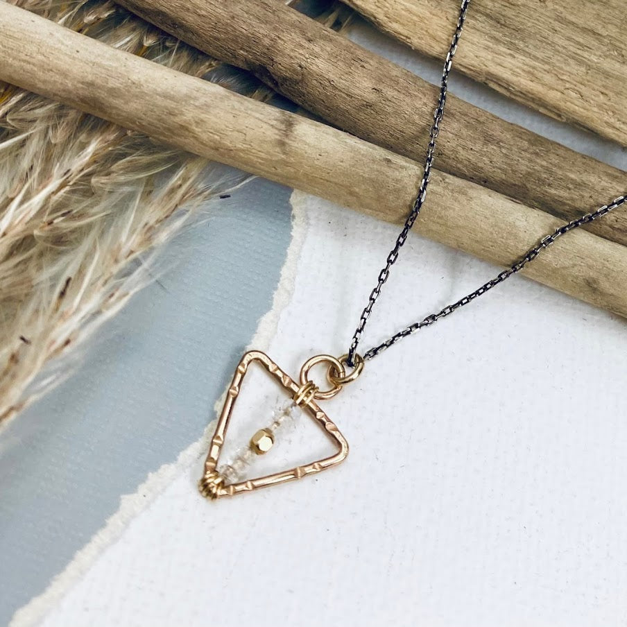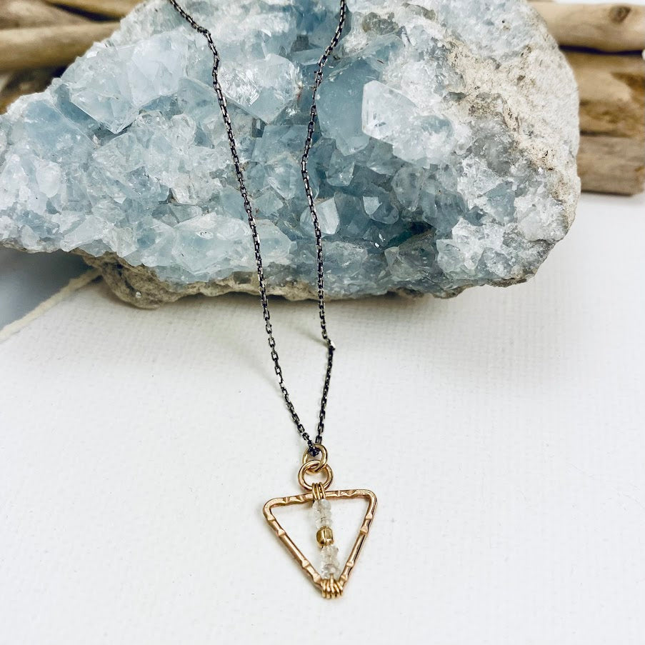 The Alchemy Collection showcases the transformative beauty of handmade oxidized sterling silver and gold filled triangle components. Adorned with mesmerizing dendrite opal and moonstone gemstones, each piece captures the essence of mystical allure and celestial grace. This collection harmoniously merges the contrasting metals and ethereal gemstones, resulting in timeless creations that invite the wearer to embark on a personal journey of alchemical transformation.