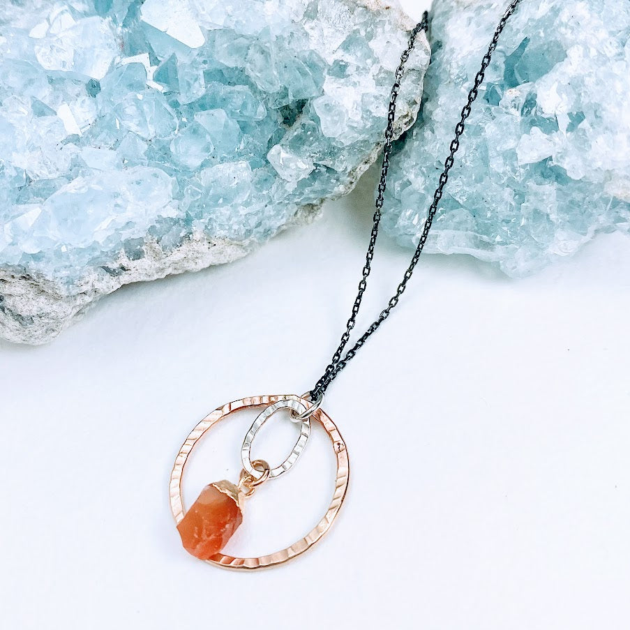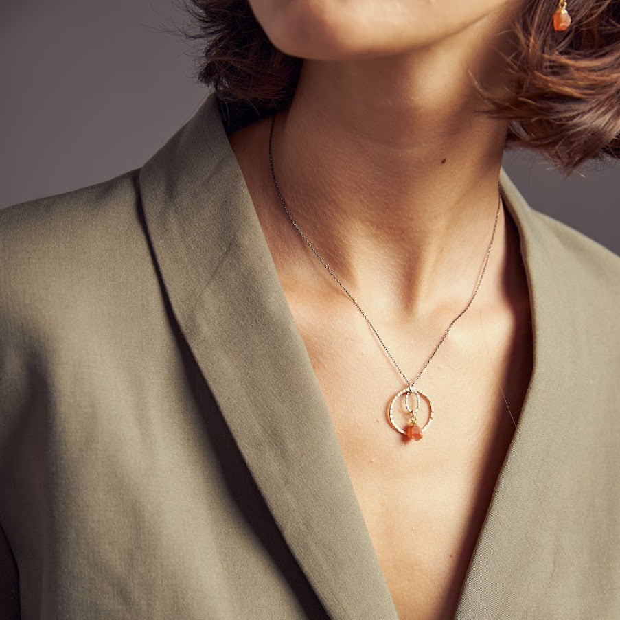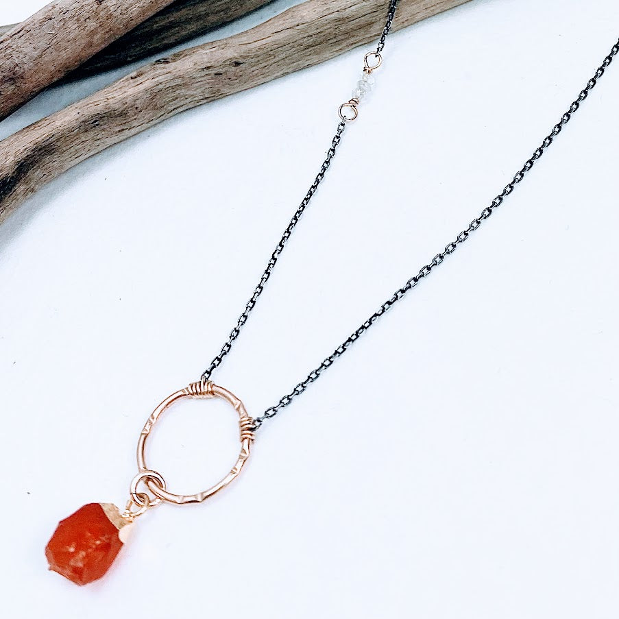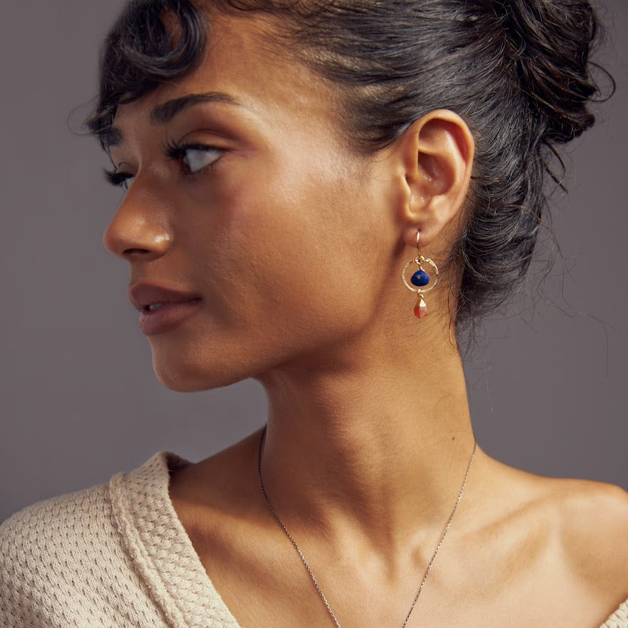 The Contrast collection is a stunning assortment of handmade jewelry that beautifully juxtaposes mixed metals, lapis lazuli, moonstone, and carnelian gemstones. The collection thrives on the interplay between contrasting elements, with the mingling of different metals creating a captivating visual harmony. The deep blue hues of lapis lazuli, the ethereal glow of moonstone, and the fiery energy of carnelian gemstones add layers of color and intrigue to each piece. This collection is a testament to the power of combining diverse elements, resulting in captivating and harmonious designs that embody the beauty found in opposites.